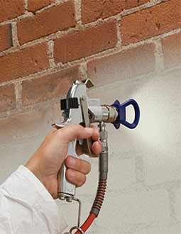 Применение высокотехнологичных агрегатов позволяет снизить сроки производства работ в 4 раза. Безвоздушный метод предотвращает образование «тумана», направленное действие исключает перерасход краски.